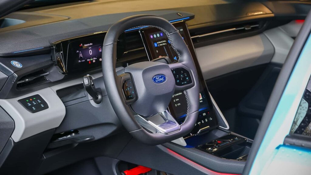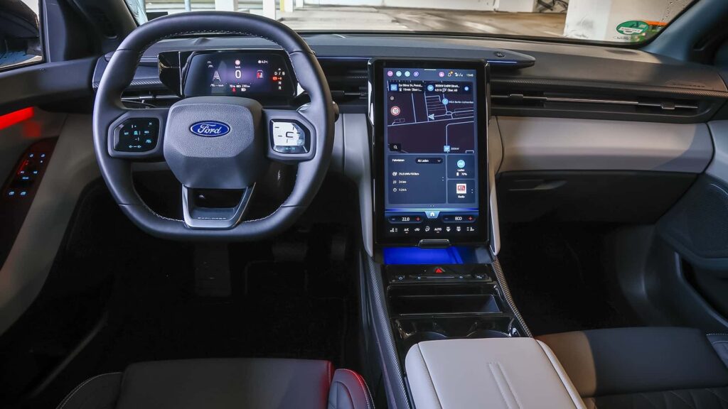 Der Ingenieurs-Kompromiss: Ford opfert die minimalistische, aber oft kritisierte Bedienphilosophie von VW für ein eigenständiges, durchdachteres und hochwertiger wirkendes Cockpit. Statt eines winzigen Fahrerdisplays gibt es einen vollwertigen 5-Zoll-Bildschirm hinter dem Lenkrad. Das zentrale Element ist jedoch der riesige, 14,6 Zoll große Hochformat-Touchscreen, der sich im Winkel verstellen lässt. Darunter befindet sich eine innovative „Soundbar“. Die Materialqualität und das Design wirken insgesamt eine Stufe hochwertiger und durchdachter als im ID.4.